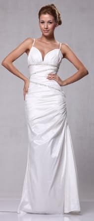 Off white bridal wedding gown with sequins and beads detail, sweetheart deep v-neck, gathered fabric on hip. Fully lined with built in bra.